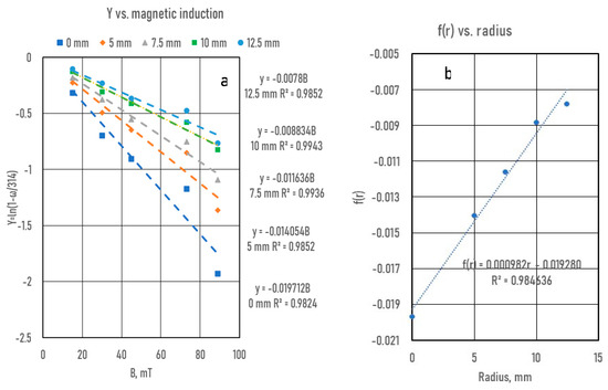 In Figure 19a, Y is shown as a function of B at five different radiuses. If the R2 > 0.98, then the error is acceptable. The slope (f(r)) of the Y functions can be seen in Figure 19b as a function of r: