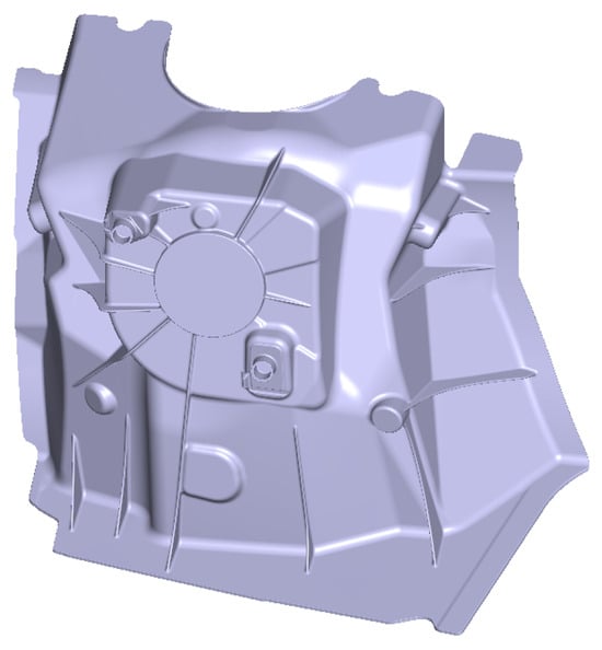The die used was a single cavity component, so during the evaluations only one shock tower (Figure 1) component was produced per shot. The shock tower used for the test had an area of 1960 cm2 and a volume of 1631 cm3 with a wall thickness from 4.5 to 5.0 mm. After the mold extraction, these components were quenched in water at a constant temperature of 25 °C for three seconds. Some of the components were quenched, while others were not quenched, to evaluate and analyze the mechanical properties of the alloy and compare the difference between quench and no-quench treatment parts. All shock towers were evaluated after being out of the die casting machine as F temper for both cases with quench and without quench. Some samples remained untested and were kept at ambient condition for the purpose of evaluating the behavior of the mechanical properties of the AuralTM-5 over different periods of time, and thus understanding its behavior due to its natural aging process. The first samples were evaluated within the first 24 h and were subsequently evaluated every week until reaching the eighth week to analyze the mechanical properties with natural aging of the F temper parts.