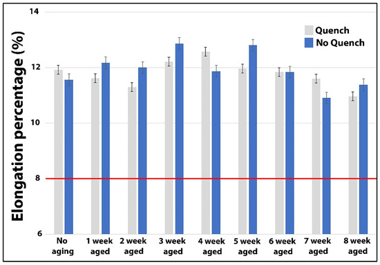 The as-cast shock towers with no aging met the theorical specifications of AuralTM-5 of yield strength ≥ 110 MPa, ultimate tensile strength ≥ 240 MPa, and elongation ≥ 8%. For both subsequent cases with quench and without quench treatment, the shock towers achieved values on the mechanical properties above the minimum Aural-5TM specifications. As is shown in Figure 4, the result of aging on the elongation characteristic for the samples with no quench through the weeks was above 11% on average. In general, there was a slight increase in this attribute when comparing quenched versus not quenched components (5%).