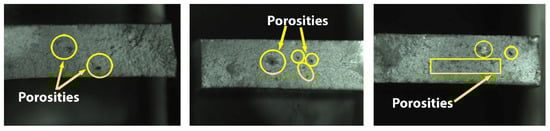 The shock towers did not show any defects caused by pre-solidification or shrinkage porosity, which are mainly caused by high temperature differences in solidification; this was a main concern due to the low percentage of silicon and the high temperature set up at the dosing furnace, as shown in Figure 8 and Figure 9. The main defects detected in the mechanical property’s samples were small porosities generated due to the process [20,21,22,27,28,29,30,31].