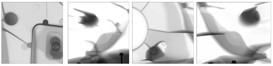 Additionally, the shock towers were analyzed with X-ray radiography equipment YXLON (MG325, Hamburg, Germany) to verify if there could be other types of defects found in the parts as shrinkage, and to validate the internal integrity of the shock towers. The parts that were analyzed did not show any concern of porosity or shrinkage due to AuralTM-5 alloy or due to the process. Figure 8 shows the area of the shock tower with more mass, where it can be observed that there are no significant defects in these areas.