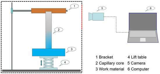 Figure 3 shows the capillary pumping testing device. The testing device consisted of a capillary pumping testing part, mechanical lifting part, and data acquisition part. The samples were simultaneously dipped into the fluid reservoir, and the fluid spontaneously rose along the wicks. The fluid level of the reservoir was thought to be constant during the capillary rise process due to the very small amount of fluid absorbed by the wicks [33]. Then, a video camera was used to record the height of the rise in the working fluid to obtain a time–height curve.