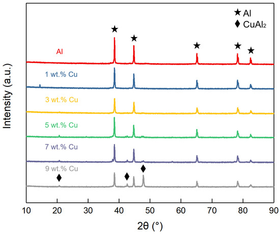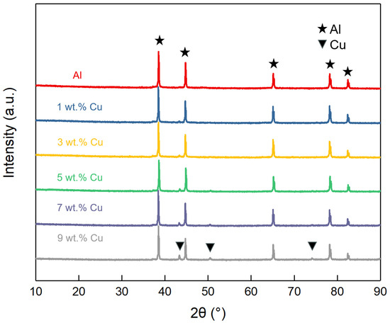 The XRD patterns of the mixed powders with different Cu contents are given in Figure 5. The results showed that only the diffraction peaks of Al were present at the beginning; then, the diffraction peaks of Cu gradually appeared with the addition of Cu content, and the peaks of Cu were higher with the increase in the content; in addition, all the powders did not have any other diffraction peaks. It can be observed that the mixed powder consisting of Cu, Al, and zirconia balls did not react after 2 h of mechanical mixing at 120 rpm at room temperature and still maintained its original composition.