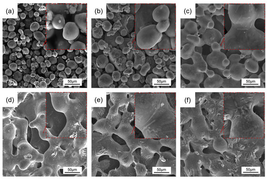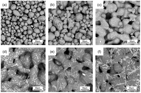 The microstructures of porous Al wicks prepared with different Cu contents are shown in Figure 6. It can be seen that there were numerous pores with different sizes distributed throughout the specimens. A three-dimensional, interconnected pore structure was formed, with adjacent particles interconnected to form a base skeleton. The pore size was influenced by the particle size. Most of the larger pores were formed between the larger particles, while the smaller pores were formed with the involvement of the smaller particles. Figure 6a shows that without the addition of Cu there was almost no bonding between the Al powders, indicating that the oxide film on the powder surface strongly inhibited the sintering of the Al powder. With the addition of Cu, the formation of sintering necks between powders was clearly observed, which increased with increasing Cu content, suggesting that the sintered sample has sufficient strength for application. Furthermore, the interconnected skeleton and three-dimensional interconnected pores between particles gradually improved (Figure 6b,c). When the Cu content exceeded 5 wt.% (Figure 6d–f), the sintering neck obviously grew larger, and the small particles gradually integrated into the large particles to form coarser cell walls. As the Cu content increased, the porosity significantly decreased, and the connectivity of the pores also deteriorated. The addition of a large amount of Cu makes the mixture prone to forming an intermediate phase with a low melting point through the reaction with Al2O3 or Al, which are in the liquid phase during sintering. With fewer liquid phases, the particles become wet, and their interstices are penetrated, promoting the formation of sintered necks. With more liquid phases, the Al particles are wrapped and the powder undergoes rearrangement and accelerated densification behaviors under the action of surface tension, leading to a remarkable increase in the density of the sintered samples [36,37]. Alternatively, the equilibrium concentration that is dissolved in the intermediate phase can vary due to the different particle sizes, with smaller particles dissolving more and precipitating on the surface of the larger particles, corresponding to the variation in the particle sizes in Figure 6. These changes corroborate the promotional behavior of Cu on the sintering of the porous Al wick.