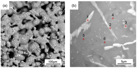 Figure 10 displays a backscattered electron (BSE) image of porous Al with a Cu content of 5 wt.%. Based on the energy-dispersive spectroscopy (EDS) results (Table 1), the Cu content of the dendritic precipitation phase reached 15–20 at.%, the Cu content of the dotted precipitation phase was 5–10 at.%, and the Cu content of the basal phase was in the range of 0–2 at.%. The elemental ratios of the precipitated phases did not correspond to the atomic ratios of the CuAl2 phase, and the chemical composition of the metallographic fractions at the first point was roughly equal to the atomic percentage of the (αAl + CuAl2) eutectic, suggesting that they may be (αAl + CuAl2) eutectic organizations. When sintering a porous Al wick with 5 wt.% Cu, Al2O3 reacts with CuO and takes the lead in destroying the external alumina film centered on the contact points of Cu and Al powders. Then, Cu particles contact the Al atoms inside Al particles, and Cu atoms enter the Al crystal structure through solid-phase diffusion, occupying vacancies to form the CuAl2 alloy, which is in the liquid phase at 600 °C. The liquid phase wets and wraps the Al particles and diffuses to the entire surface of the pore structure; solid-phase diffusion transforms into liquid-phase diffusion; the atom movement speed accelerates, promoting the formation of a sintering neck; simultaneously, more Al atoms enter the Al-Cu liquid phase, increasing the liquid phase, and, in the subsequent cooling process, turn to precipitate (αAl + CuAl2) eutectic and Al solid solution. Combined with the sample morphology and porous organization, it can be understood that, with the increase in Cu content, there are more powder reaction points and more Cu diffusion channels, and more CuAl2 liquid phases are formed during sintering, which are able to cover the Al powder more quickly. The phenomenon of particle rearrangement occurs, which is conducive to the formation of the sintering neck, and the formation of eutectic organization is increased.