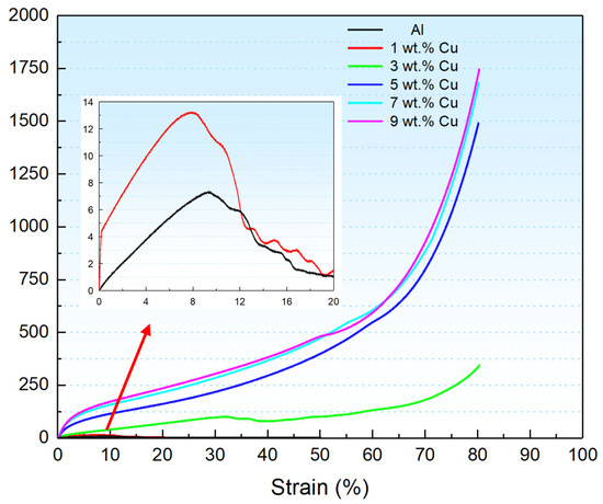 Figure 11 presents the compressive stress–strain curves for samples with varying Cu contents. Porous Al wicks with Cu contents ranging from 0 wt.% to 1 wt.% showed no plateau stress in the stress–strain curves. Because of the low degree of particle bonding, the stress initially increases with the strain; however, when the deformation reaches a certain value, the stress decreases, and the sample breaks. In contrast, the stress–strain curve of the porous Al wicks with 3 wt.%~9 wt.% Cu showed an increasing trend with no fracture under pressure, behaving as a typical porous material [39]. As the Cu content of the sample increased, the stress at the same deformation also increased. This indicates that the addition of Cu improves the mechanical properties of the porous Al and changes its fracture behavior.