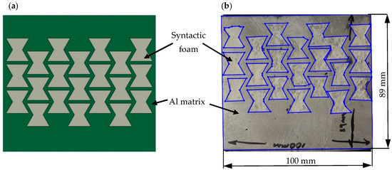 The arrangement of the unit cells is shown in Figure 2a, where the positioning of the 7 × 3 unit cells in the aluminium matrix and the syntactic foam inserts are shown.