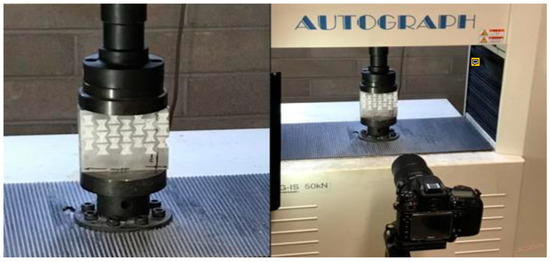 Compressive testing of one fabricated sample was conducted on a 50 kN Shimadzu uni-axial testing machine. Only one sample was used in this research to test the method of design and fabrication. However, more samples need to be tested in future work to provide statistically significant results. The sample was positioned between two stainless steel compression platens and compressed at a quasi-static loading velocity of 0.2 mm/s, as shown in Figure 3. Before the test, the sample’s top surface was machine-cut to guarantee a good contact surface and parallel alignment between the sample and the steel heads. Additionally, the sample’s out of-plane surfaces were cleaned and may have had some excess aluminium removed using silicon carbide sandpaper.