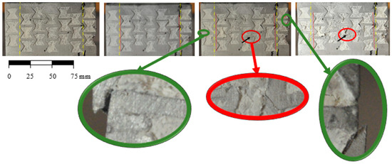 Deformation behaviour of the sample with marked and detailed location of the cracks (strain increment: 1%).