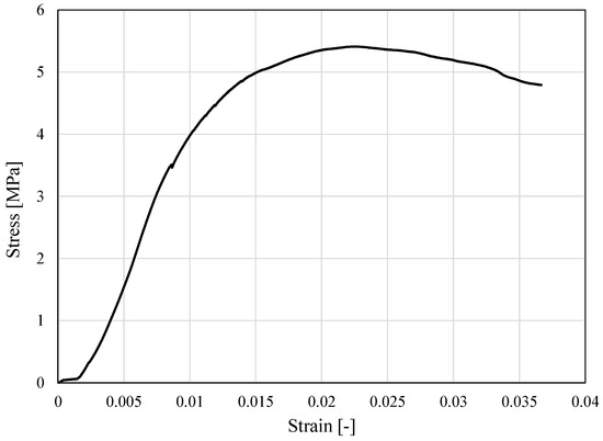 Figure 5 shows the compressive stress–strain data of the auxetic syntactic foam, where the engineering stress–strain values are calculated using the initial sample’s geometry. Following settling effects at low strains, an approximately linear elastic stress increase can be observed. This segment terminates in a slight stress oscillation that coincides with the fracture of aluminium struts at the edges of the sample, which is marked with green circles in Figure 4. Additionally, some separation between the matrix and SF appears, which is highlighted by a red circle in Figure 4 and can be observed in the middle of the sample. At higher strains, the engineering stress stabilises around 5 MPa and gradually declines for strains .