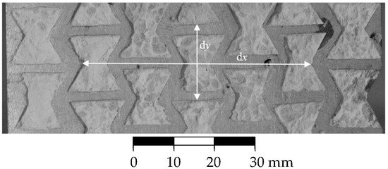 The metallic matrix of re-entrant hexagon unit cells (Figure 1) was chosen to realise auxetic deformation behaviour in the composite foam material. This configuration, previously established to exhibit auxetic properties [22,23,24], comprises individual re-entrant hexagon (“hourglass”) shapes as an inverse space. These voids were filled with a lightweight syntactic foam material, serving two essential functions: reinforcing the auxetic composite and acting as a space holder during casting.
