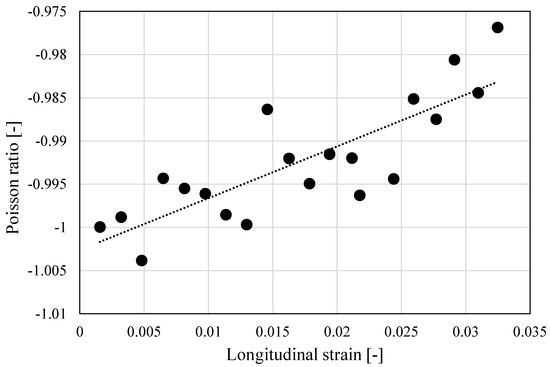 High-resolution light photographs were captured with a frequency of 0.1 Hz during compressive testing. Image analysis was used to determine Poisson’s ratio using the geometrical distances and indicated in Figure 6. Figure 7 shows the variation in Poisson’s ratio until the maximum tested longitudinal strain (). The results demonstrate a very high initial Poisson’s ratio of , which reduces only slightly during the plastic deformation until maximum tested strain, proving a distinct auxetic behaviour of the structure.