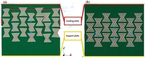 The upper edge of the model was prescribed with a displacement of 2 mm in the negative direction of the y-axis, as shown in Figure 8. The bottom edge was fixed (all displacement and rotations are disabled). Additionally, extra support was added on the front surface with z-axis displacement constrained, preventing the entire structure from deflecting in an out-of-plane direction. The implicit static calculation step with the default solver was used for calculation.