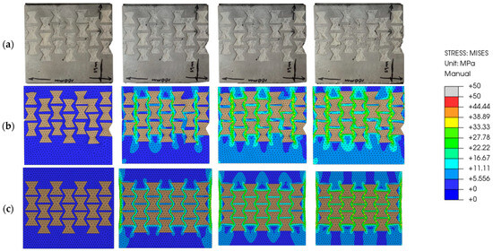 The deformation behaviour comparison of the experimental sample and actual and idealised FE models is presented in Figure 9. The actual FE model provides detailed insights into the non-symmetrical deformation behaviour of the metamaterial due to the fabrication defects. The idealised model (Figure 9c) deforms symmetrically and exhibits visible auxetic behaviour. The syntactic foam inserts offer support for the matrix, which decreases the stress concentration at the edges of the matrix structure.