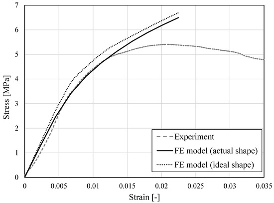 As shown in Figure 10, the reaction forces acting on the support plate of the simulation and the experiment are similar. However, when plastic deformation occurs in the experimental testing, the force declines more rapidly than in the purely elastic simulation. To improve the agreement at higher strains, the computational model must include plastic material behaviour, which will be carried out in our future work. As already expected from the deformation behaviour (Figure 9), the simulation of the ideal geometry results in a stiffer response than the actual geometry, although the ideal model based on geometry shown in Figure 2a has a 7% lower amount of aluminium matrix phase in the area of the re-entrant unit cells.