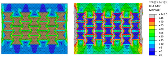 The validated computational models enable the study of different geometries. The structure with a wider auxetic phase, named here also as “Ideal v2”, was developed and virtually tested to study the influence of the stiffness ratio between the matrix and SF phase on the deformation response. The Ideal v2 structure is compared to ideal structures at the same strain level in Figure 11. It can be seen that the stresses are up to 100 MPa in the structure with wider auxetic struts since the matrix is stiffer and at the same global compressive deformation which results in higher stresses in the structure. This showed that with the adaption or optimisation of the matrix geometry, the load-bearing capabilities of the structure can be easily tailored to the specific need of the application.