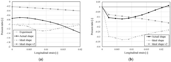 When observing the deformation at the edge of the sample (Figure 12b), it can be observed that the model with the actual shape initially behaves like an auxetic material. At higher longitudinal deformations, the Poisson’s ratio reaches a positive value. On the other hand, the ideal shape samples provide a more significant auxetic response up to all ranges of analysed strains (the Poisson’s ratio is decreased from −0.12 to −0.32). The increase in the thickness of matrix struts in the case of the Ideal shape v2 model results in slightly less negative values of Poisson’s ratio (increase from −0.32 to −0.16), which is caused by the changed stiffness ratio between the matrix and foam filler. For all models with the perfect specimen shape, it can be seen by both methods that the models behave like auxetic material throughout the simulation.