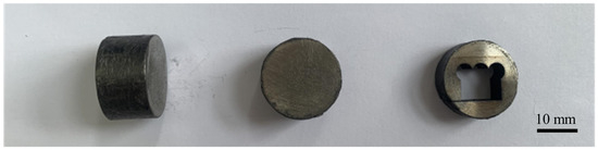 The as-received Ti and Al powders (99.7% purity), with an average particle size of 45 μm (ZhongNuo Advanced Material (Beijing) Technology Co., Ltd., Beijing, China), were used as the raw materials for milling. The total weight of the powder is 10 g. The mixed Ti-50at.%Al powders (weighing powder: 6.395 g of Ti powder, 3.605 g of Al powder, and 0–0.300 g of stearic acid) with 0 wt.%, 1 wt.%, 2 wt.%, and 3 wt.% stearic acid (CH3(CH2)16COOH) and tungsten carbide milling balls with a diameter of 4 mm were put into the tungsten carbide milling vial for milling via the BM40 planetary ball mill in an argon atmosphere, where the ratio of balls to elemental powders was 10:1. In order to acquire a composite with a refined and uniform chemical microstructure, the rotation speed was 200 rpm/min, and the milling time was 10 h. After a high-energy ball mill, the ball-milled powders were sintered in the ZT-40-21Y vacuum hot-pressing sintering furnace at a temperature of 1150 °C and subjected to a pressure of 30 MPa at a vacuum condition for two hours. The obtained samples (with 2 wt.% stearic acid) are shown in Figure 1, with sample sizes of Φ 20 mm × 10 mm. In addition, one out of every three samples was used for room-temperature compression testing, and the number of compression tests for each sample prepared with different amounts of stearic acid added was one. The weight and density of the sample measured after sintering with different amounts of stearic acid added in ball milling are shown in the Table 1.