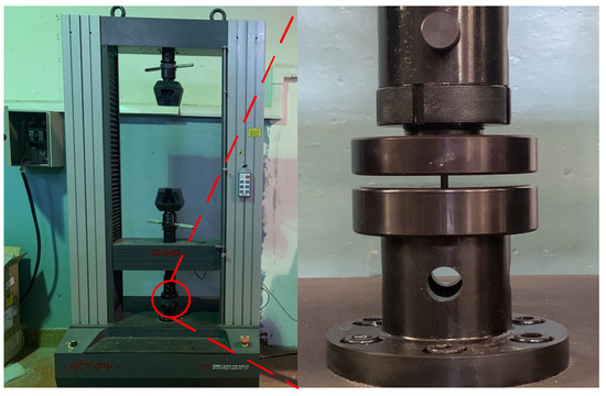 This study used the CMT5105 microcomputer-controlled electronic universal testing machine (as shown in Figure 2) to conduct compression tests on the (Ti2AlC + Al2O3)p/TiAl composites prepared. Three cylindrical specimens with dimensions of Φ 4 mm × 6 mm were cut from the sintered material, and the upper and lower surfaces were simply polished. Then, the compressed specimens were subjected to room-temperature compression testing at a strain rate of 0.25/min.