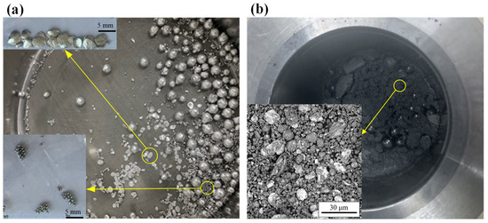 Figure 3 shows the morphology of TiAl ball-milled powders without adding 2 wt.% stearic acid. As shown in Figure 3a, the surface of the grinding balls was coated with a layer of ball-milled products with metallic luster. Additionally, some fine, spherical, and flaky ball-milled products can be observed. This phenomenon was attributed to the severe cold welding of ductile aluminum powder. During the ball-milling process, the Ti and Al powder mixture suffered from the impact of grinding balls at high speed. Mass fresh surfaces of TiAl powders (Stanford Advanced Materials (SAM), Lake Forest, CA, USA) were produced, and their surface energy increased, which was conducive to joining together powders, as well as joining powders and the inner wall of the milling vial and the surface of the grinding ball. This resulted in an increase in the collision probability between the grinding balls, and the temperature of the milling vial rose rapidly. As the temperature approached the melting point of Al, Al powder melted and adhered to the surface of the milling vial and grinding balls. When the thickness of the TiAl powders adhered to the surface of the grinding balls increased, part of the adherent TiAl ball-milled powders on the surface of the grinding balls fell off under the impact of the grinding balls and formed a flaky morphology. Some TiAl ball-milled powders presented spherical particle morphology due to the effect of the surface tension of molten Al liquid.