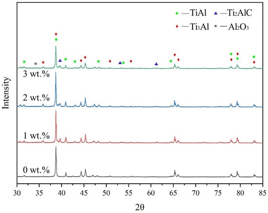 The XRD patterns of (Ti2AlC + Al2O3)p/TiAl composites prepared by adding different contents of stearic acid (0 wt.%, 1 wt.%, 2 wt.%, and 3 wt.%).