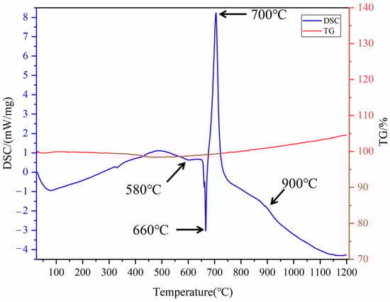 In order to further reveal the reaction mechanism of (Ti2AlC + Al2O3)p/TiAl composites, TG-DSC analysis was carried out on TiAl ball-milled powders with 2 wt.% of stearic acid, as shown in Figure 5. The DSC curve showed that there were two endothermic peaks and two exothermic peaks: when the temperature rose to around 580 °C, a relatively weak endothermic peak was observed; when the temperature reached around 660 °C, the second significant endothermic peak was observed. The first significant exothermic peak was observed when the temperature rose to 700 °C. After that, a less obvious exothermic peak appeared near 900 °C.