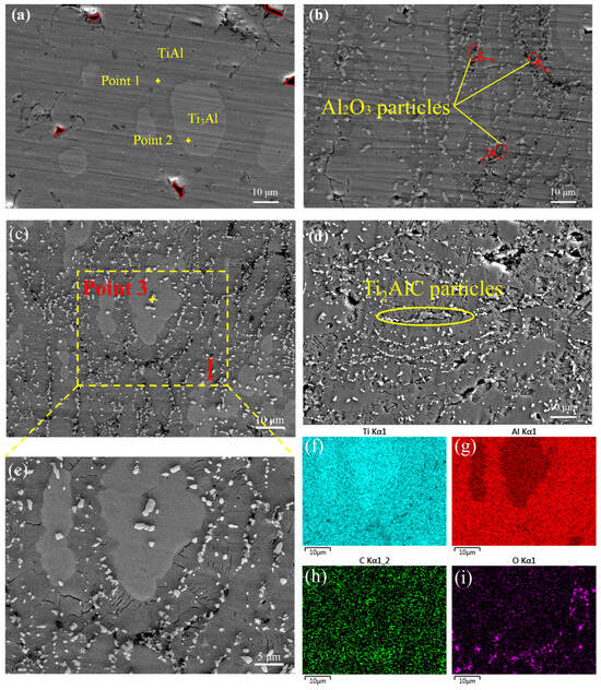 In addition to Ti2AlC particles (white particles), some black particles (indicated by the red arrows in Figure 6b) were also found attached to the chain-distributed Ti2AlC enhancement phase. To determine the composition of the black particles, EDS surface scanning was performed on selected area I in Figure 6c, as shown in Figure 6f–i. It can be observed that the Ti-rich region in Figure 6f and the Al-poor region in Figure 6g corresponded to the Ti3Al phase in Figure 6e. The distribution of C elements in Figure 6h was lower than that of Ti and Al, while the C-rich region corresponded to the distribution of the Ti2AlC phase in Figure 6e. It can be seen from the distribution of the O element in Figure 6i that the content of O was less than that of C, and the O-rich regions exhibited a discrete distribution, which corresponded to the black particles in Figure 6e one by one. By combining the phase results of Figure 6e and the XRD results, it could be concluded that the O-rich black particles were Al2O3.