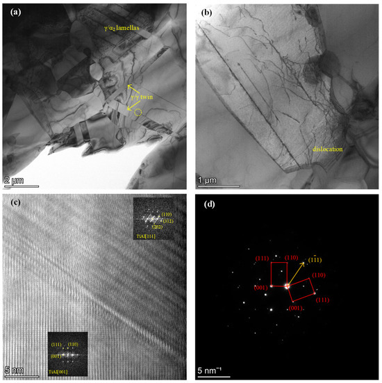 As the DSC curve in Figure 5 shows, with the melting of Al, the liquid Al can effectively increase the reaction rate of Ti and Al atoms, which releases a large amount of heat and produces a high temperature that may reach the α phase region in the local area. With the end of the exothermic reaction of TiAl intermetallic, the temperature is gradually consistent with the temperature of the furnace, and it is stable in the (α + γ) phase region. When the material is kept at the temperature of the (γ + α) phase region for a certain time, the newly formed equiaxed γ phase will be transformed into more stable γ/α2 lamellar aggregates. In addition, in Figure 8a, the twin structures (indicated by the yellow arrows) are observed, and the HRTEM image of the γ/γ twin boundary is shown in Figure 8c. The selected electron diffraction patterns of the yellow dotted circle in Figure 8a are shown in Figure 8d. In Figure 8c, it can be seen that the TiAl diffraction lattice has different orientations. According to the SAED of the γ/γ twin boundary, it can be noted that the direction is the axis of symmetry, with a 60° mirror symmetry. The formation of twin structures in the γ-TiAl phase is mainly attributed to the hot deformation in the process of sintering. In this paper, in order to obtain dense composites, when the sintering temperature rises to 1150 °C, the composites will suffer from pressure from the liquid head. Under this condition, the dislocation at the TiAl grain boundaries forms, as shown in Figure 8b. Due to the absence of a slip system for γ-TiAl, the interface dislocation can only move along the interface; when the dislocation stacking structure is formed, it is difficult to remove. As local stress concentrates, the dislocations will enter γ grains and form deformation twins.