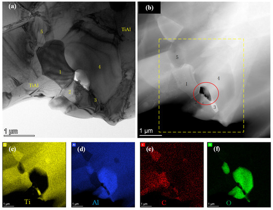 (Ti2AlC + Al2O3)p/TiAl composites (with 2 wt.% stearic acid added during ball milling, prepared by sintering at 1150 °C): (a) BF-TEM image; (b) HAADF-SETM image; (c–f) EDX element distribution diagram in the yellow rectangular box area in (b), corresponding to Ti, Al, C, and O elements, respectively.