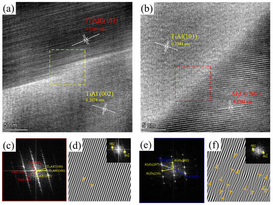 Figure 10a,b are HRTEM images of the Ti2AlC/TiAl interface and the Al2O3/TiAl interface, respectively. In Figure 10a, the upper part is Ti2AlC; the crystal plane spacing of Ti2AlC-(101) is 0.2589 nm; the lower part is TiAl; and the crystal plane spacing of TiAl-(002) is 0.2078 nm. In Figure 10b, the upper left part is TiAl; the measured TiAl-(101) crystal plane spacing is 0.2344 nm; the lower part is Al2O3; the measured crystal plane spacing of Al2O3-(202) is 0.2381 nm. The FFT image of the Ti2AlC/TiAl interface that is marked by a red dashed rectangle is shown in Figure 10c. It can be noticed that the TiAl-(110)//Ti2AlC-(101). This orientation between TiAl and Ti2AlC makes the bonding of Ti2AlC at the interface of the TiAl matrix more stable [33]. Additionally, the IFFT image of the TiAl(002) and TiAl-(00) planes is shown in Figure 10e, where the TiAl is close to Ti2AlC. It can be seen that there are few dislocations in the TiAl grains at the Ti2AlC/TiAl interface in Figure 10e, while, for the FFT image of the TiAl/Al2O3 interface, there is a slight deflection between Al2O3-(207) and TiAl-(002) (as shown in Figure 10d). Cui et al. [34] referred to the Al2O3-(006)//TiAl-(111), which exhibits a coherent relationship. Thus, the interface between Al2O3 and TiAl is bounding well. However, compared with the IFFT images of the TiAl-(002) and TiAl-(00) planes in Figure 10f, where the TiAl is close to Al2O3, it can be found that a large number of dislocations are located at the TiAl matrix near Al2O3, and the closer TiAl is to Al2O3, the higher the dislocation density is. This phenomenon means that when the material is subjected to external loading, compared with the “soft” Ti2AlC-enhanced phase, the Al2O3 particles have a stronger ability to anchor the dislocation in the TiAl matrix. The same phenomenon was observed by Cui et al. [35]. They found that a mass of dislocations was stored in the TiAl matrix near the Mo2B5 nanoparticle region, which proves the pinning effect of Mo2B5 particles on dislocations was stronger than that of Ti2AlC particles.