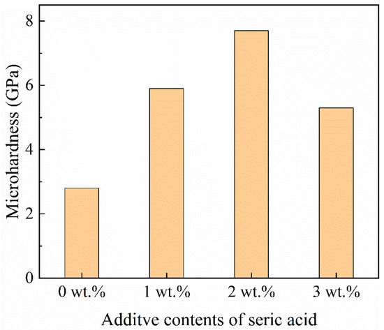 Figure 11 shows the microhardness of the sample without added stearic acid and (Ti2AlC + Al2O3)p/TiAl composites prepared by adding 1 wt.%, 2 wt.%, and 3 wt.% stearic acid during the ball-milling process at a sintering temperature of 1150 °C. As seen in Figure 11, the hardness of the sample without added stearic acid is the lowest, and its microhardness is 2.8 GPa. For the microhardness of (Ti2AlC + Al2O3)p/TiAl composites, meanwhile, the microhardness increases firstly and then decreases with the increase of stearic acid addition. The maximum microhardness of the (Ti2AlC + Al2O3)p/TiAl composite prepared by adding 2 wt.% stearic acid is 7.7 GPa. However, when the additive dosage of stearic acid is 3 wt.%, the hardness decreases.