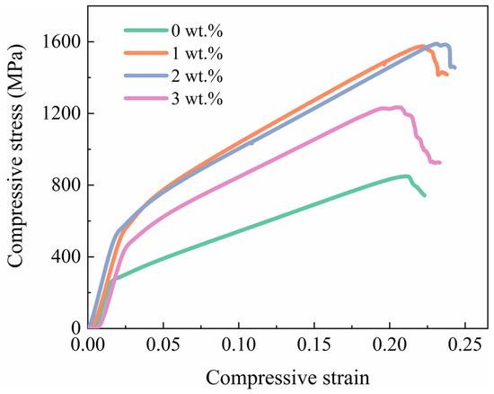 Figure 12 shows the room-temperature compressive stress–strain curves of (Ti2AlC + Al2O3)p/TiAl composites prepared by sintering at 1150 °C with different stearic acid additions. It can be seen in Figure 12 that the compressive properties of (Ti2AlC + Al2O3)p/TiAl composites are sensitive to the additive amount of stearic acid. The yield strength and maximum compressive strength of the composite increased with the increase in stearic acid content from 0 wt.% to 2 wt.%. The composite prepared by adding 1 wt.% had similar compressive properties to that prepared by adding 2 wt.%, and the composite prepared by adding 1 wt.% had a higher yield strength. The maximum compressive strength and fracture strain were found in the 2 wt.% composites. However, the yield strength and maximum compressive strength of the (Ti2AlC + Al2O3)p/TiAl composites decreased when the addition of stearic acid increased by 3 wt.%. As shown in Table 3, the maximum compressive strength of the TiAl alloy and (Ti2AlC + Al2O3)p/TiAl composite prepared with 0 wt.%, 1 wt.%, 2 wt.%, and 3 wt.% stearic acid additions is 850 MPa, 1574 MPa, 1590 MPa, and 1234 MPa, respectively. The yield strengths are 266 MPa, 542 MPa, 538 MPa, and 464 MPa, respectively. When the strength is increased, the fracture strain is also increased and is 0.214, 0.231, 0.241, and 0.217, respectively.