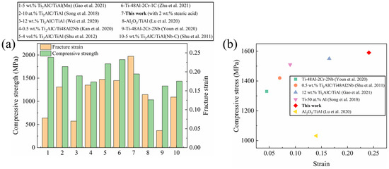 (a) Comparison of compressive strength and fracture strain of different TiAl matrix composites. (b) Compressive stress–strain relationship of different TiAl matrix composites [20,23,30,37,38,39,40,41,42,43].