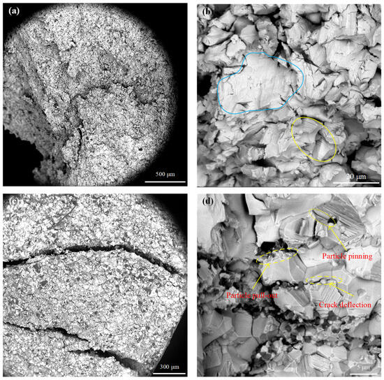 Figure 14c,d show the failure morphology of (Ti2AlC + Al2O3)p/TiAl composites prepared by adding 2 wt.% stearic acid. As seen in Figure 14c, the main crack of the sample begins to expand from the top of the sample. After a certain distance of expansion perpendicular to the section, it begins to rapidly expand along the direction of 45°, which belongs to the shear stress, leading to crack growth and failure. According to the (Ti2AlC + Al2O3)p/TiAl composite compression failure morphology at room temperature with magnification in Figure 14d, complex mixed failure modes can be observed. The failure of the TiAl matrix is still typical of intergranular and transgranular fractures. In addition, it can be seen that the cracks spread along the Ti2AlC + Al2O3 boundary of the TiAl matrix, and the cracks deflect at the reinforced particles. Meanwhile, the reinforced particles pull out, and pinning can also be found, both of which make the crack propagation path greatly increased, improving the TiAl composite’s toughness.