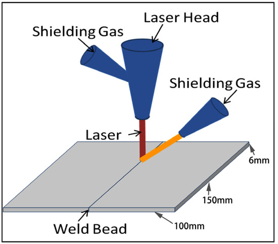 The chemical composition of the near-α Ti-4Al-2V plates, as shown in Table 1, was measured by a physicochemical phase analysis method. Laser welding was conducted by an HWF-160 laser welding system, and Figure 1 shows the schematic diagram of the laser welding process on a Ti-4Al-2V plate with the dimensions of 150 mm × 100 mm × 6 mm. The welding parameters, including different levels of laser power, welding speeds, and defocus distances, are shown in Table 2. The dimensions of the joined Ti-4Al-2V plate were 150 mm × 200 mm × 6 mm. During the welding process, above 99.99% purity argon was used as the shielding gas on the front and back of the weld joints to prevent oxidation.
