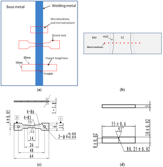 Sampling position and specifications of sample for the mechanical property tests. (a) Sampling positions; (b) micro-Vickers hardness test; (c) tensile test; (d) Charpy impact test.
