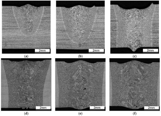 In this study, no internal porosity defects were observed in Joint (1)–(4) (Figure 3a–d). Nevertheless, when the energy density of welding increased, caused by the laser power increasing or the welding speed decreasing, evident internal porosity defects appeared, as shown in Figure 3e–g. The results showed that for a 6 mm thick Ti-4Al-2V alloy plate, a 4.2 kW laser power combined with a 20 mm/s laser speed could avoid internal defects. Further increases in the laser power or decreases in the welding speed will lead to the keyhole’s instability and internal porosity defects.
