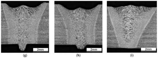 Macro-morphology of the cross-sections of the weld joints. (a) Joint (1); (b) Joint (2); (c) Joint (3); (d) Joint (4); (e) Joint (5); (f) Joint (6); (g) Joint (7); (h) Joint (8); (i) Joint (9).