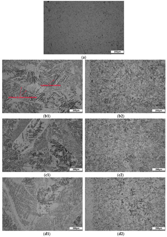 Figure 4b2,c2,d2 show the HAZs of Joints (4)–(6). A clear gradient microstructure from the equiaxed grains on the side near the BM to needle like phases on the side near the FZ can be observed. This is because the shorter the distance to the FZ, the more heat is received and the higher the cooling rate, resulting in larger β grains and needle-like α-phases. Nevertheless, in a comparison of the three welding conditions, there was no significant difference in the microstructure of the HAZ.