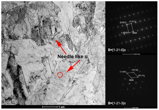 Since there was no significant difference in the microstructures of the FZ and HAZ of the weld joints under the nine conditions shown in Figure 3, the enlarged FZ and HAZ microstructure of the BM, Joints (4)–(6) were analyzed further, as shown in Figure 4. As shown in Figure 4a, equiaxed grains with a size of approximately 30 μm can be observed in the BM, which formed after rolling and annealing. Under the three conditions shown in Figure 4b1 (4.7 kW, 20 mm/s, and −2 mm; Joint (4)), Figure 4c1 (5.2 kW, 20 mm/s, and −2 mm; Joint (5)), and Figure 4d1 (4.7 kW, 15 mm/s, and −2 mm; Joint (6)), two types of boundaries can be observed inside the FZ, namely the grain boundaries of the primary β-phase and the boundaries of the α-phase, as shown by the arrow in Figure 4b1. Within the FZ, the needle-like phase, which is almost divided into specific clusters by the primary β grains’ boundary and the phase boundaries, was the main constituent phase. The needle-like phase was detected by TEM, as shown in Figure 5. It was suggested that the needle-like phase should be the α-phase. It is evident that some α-phases penetrate the original β grains, which was different from the previously characterized α martensite of the same titanium alloys [10,25].