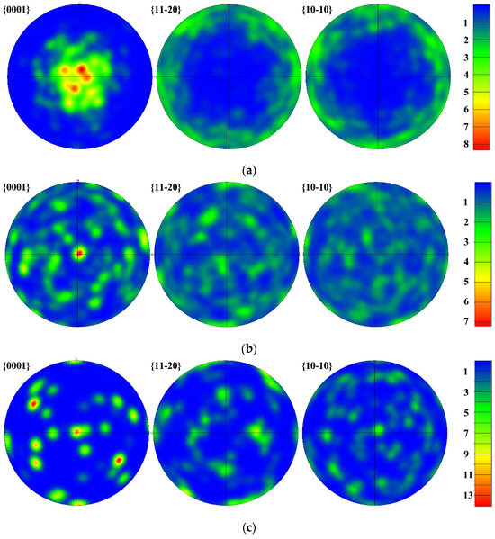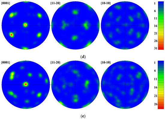 The {0001}, {11−20}, and {10−10} pole figures of the BM, HAZ, and FZ under different welding conditions were investigated to analyze the textural evolution during laser welding. The pole figure of the BM in Figure 6a shows that the Ti-4Al-2V plate formed by rolling and annealing mainly contained a {0001} fiber texture, with the maximum intensity being about 9. The texture of the HAZ was more complex. From the pole figure in Figure 6b, it can be seen that the {0001} <11−20> plate’s texture showed the highest intensity, about 8, and the intensities of other texture types were less than 3. There was no significant difference in the type of texture and the intensity of the HAZ under different welding conditions. Figure 6c–e show the pole figures of the FZ for Joints (4)–(6). The types of microstructural texture formed under the three conditions were similar, including {0001} <10−10>, {11−20} <10−10>, and {11−20} <0001> plate textures. However, the maximum texture intensity of Joint (4) was only 16, while those of Joints (5) and (6) were about 30, which was influenced by the heat input of welding (Joints (5), (6) > Joint (4)).