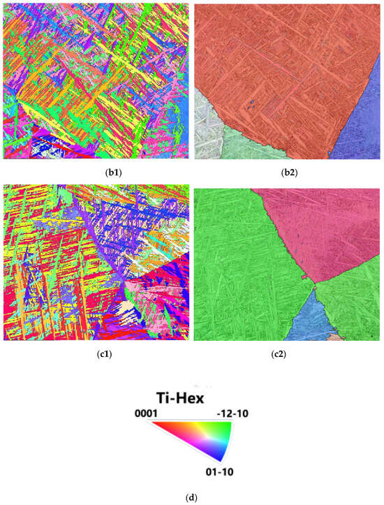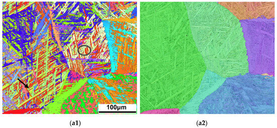 The variant selection of the weld joints with different welding conditions was investigated by EBSD. The inverse pole figures (IPFs) of the center part in the FZ under the three conditions, as shown in Figure 4, together with that of the reconstructed parent β-phase are shown in Figure 7. Compared with the morphology of the variants, they were mainly needle-like structures, indicating that under the three conditions above, the variants tended to precipitate in the form of clusters, and meaning that specific types of variants among the 12 variants appeared in a certain region, as shown by the black circles in Figure 7a1. In a variant cluster, there was a type of variant that precipitated in parallel with the others, and its length and content were significantly greater than others in the unified cluster. Massive transformation of the α variant can be detected near the original β grains’ boundaries, as shown by the black arrow in Figure 7a1. Similar phenomena can also be observed in Joints (5) (Figure 7b1,b2), and (6) (Figure 7c1,c2).