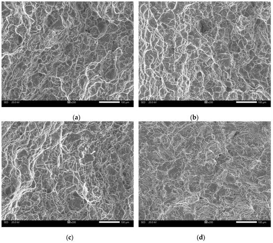 Figure 8a–c show the fracture morphology of the tensile specimens. The fracture morphologies of the three joints were mainly composed of dimples, and there was no obvious difference in the dimples’ size and distribution among the different conditions. Therefore, it can be considered that the lower elongation of Joints (5) and (6) may be caused by their internal defects. In the following discussions, the formation of porosities during laser welding and the impact of the microstructures on the tensile properties are analyzed.