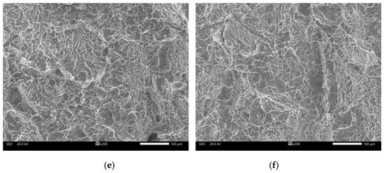 The Charpy impact toughness results showed that the impact absorption energies of Joints (4)–(6) were 45.4 ± 9.7J, 48.1 ± 5.3 J and 36.6 ± 2.0 J, respectively, and were much lower than that of the BM, which was 80.7 ± 3.2 J. The fracture morphology of the specimens for the Charpy impact toughness test (Figure 8d–f) also showed that there was no obvious difference in the three weld joints. Through a comparison of the tensile and impact (shear) fractures under the same welding conditions, shown in Figure 8, it was seen that the dimples in the shear fractures were generally smoother and shallower, while those of the tensile fractures were bigger and deeper. The difference was mainly caused by the different fracturing processes of different tests. Specifically, the process of impact fracturing occurs instantaneously, while tension fractures occur relatively slowly at a certain rate.