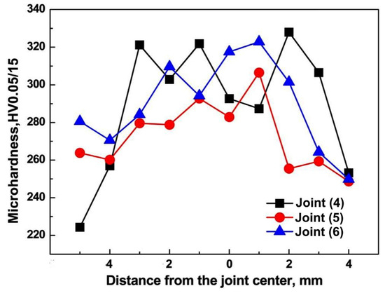 Figure 9 shows the micro-Vickers hardness distribution of Joints (4)–(6). The hardness of the FZ at the three joints were higher than those of the BM. Moreover, the hardness of Joints (4) and (6) was slightly higher than that of Joint (5). Specifically, the microhardness of the FZ is about 50–60 Hz higher than that of the BM.