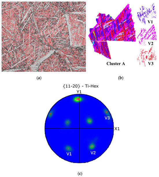 When the transformation from the β-phase to the α-phase occurs in titanium, 12 different oriented variants of the α-phase may be formed, following Burgers orientation relationship, as shown in Table 4 [34]. The 12 α-variants usually do not precipitate uniformly, as the theory suggests, but rather result in the selection of specific variants. The common forms of variant selection include the following: (1) some variants have significantly higher precipitation rates than others, resulting in an uneven proportion of variants precipitating; (2) some specific combinations of variants exhibit clustered precipitation, with a very high volume fraction in a certain region. The most common types of clusters are V1/V2/V3, V4/V5/V6, V7/V8/V9, and V10/V11/V12, which are called Type I clusters, in which each of the two neighboring α-variants are separated by a [11-20]/60° α/α boundary. This type of cluster is often characterized in additive manufactured Ti-4Al-2V, commercially pure Ti, and Ti-6Al-4V alloys [10,11,12,35]. In addition, the other four types of clusters are V1/V5/V9, V2/V4/V12, V3/V7/V11, and V6/V8/V10, named the Type II clusters, in which a [1055-3]/63.26° α/α boundary exists between each of the two neighboring α-variants. This type of cluster is relatively more difficult to form, but it has also been characterized in pure commercial titanium and Ti-6Al-4V [11,12].