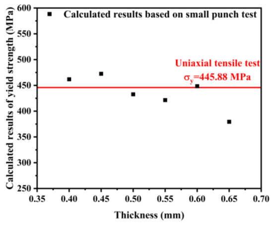- Moreno, M.F. Effects of thickness specimen on the evaluation of relationship between tensile properties and small punch testing parameters in metallic materials. Mater. Des. 2018, 157, 512–522. [Google Scholar] [CrossRef]