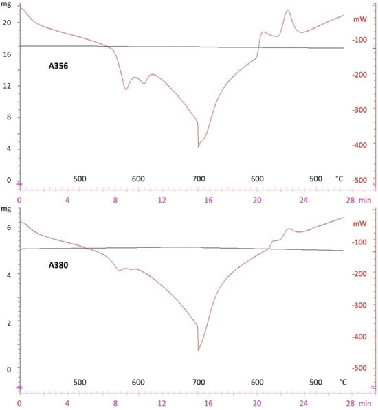 The liquidus temperature of both alloys was determined to define the pouring temperature for rheocasting experiments close to the appearance of the α(Al) phase. The samples were obtained from the ingots used as feedstock for melting. The liquidus temperatures tested by differential scanning calorimetry (DSC) are 585–595 °C for A380 alloy and 605–620 °C for A356 alloy, respectively, according to the tests run shown in Figure 1.