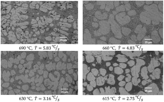 The micrographs in Figure 11 show the microstructural evolution according to the operation parameters. The melt poured and unloaded at 690 °C and 620 °C, respectively, is above the liquidus temperature and the solid appearance; in this case, a small number of globules by chilling and a high retention of dendrites were produced. The measured cooling rate is 5.83 °C/s.