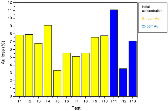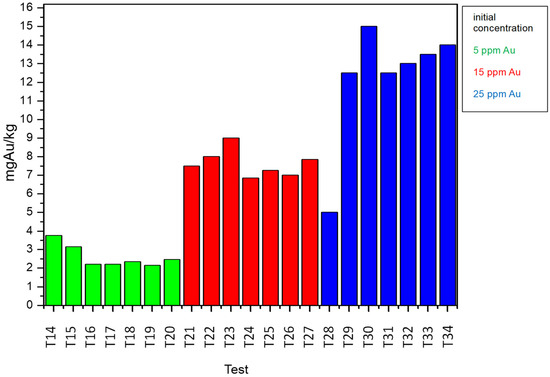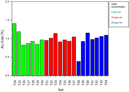 Figure 3 shows the losses of milligrams of gold per kilogram of quicklime from the excess ratio samples with 0.4 ppm Au initial concentration and Figure 4 with 25 ppm Au initial concentration obtained with Formula (2). The average loss was 1.784 mg Au/kg ql. There were no significant differences between the samples with the natural solution and those with distinct granulometry. As can be seen in Figure 3 and Figure 4, only the tests with an initial concentration of 25 ppm had much more significant losses than those with 0.4 ppm in all cases. This test implies that in the case of mg Au/kg, retention is based on the initial gold concentration since more gold is available for preg-robbing.